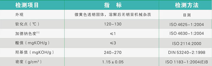 [1] 樹脂50%質(zhì)量分?jǐn)?shù)的溶液,溶劑為質(zhì)量分?jǐn)?shù)50%乙酸丁酯,50%無(wú)水乙醇。