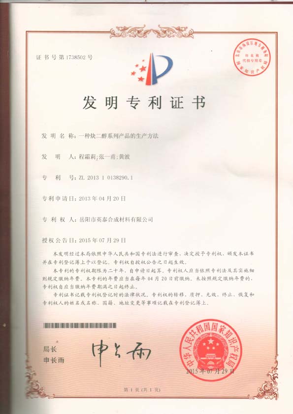 專利二:一種炔二醇系列產(chǎn)品的生產(chǎn)方法